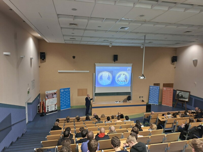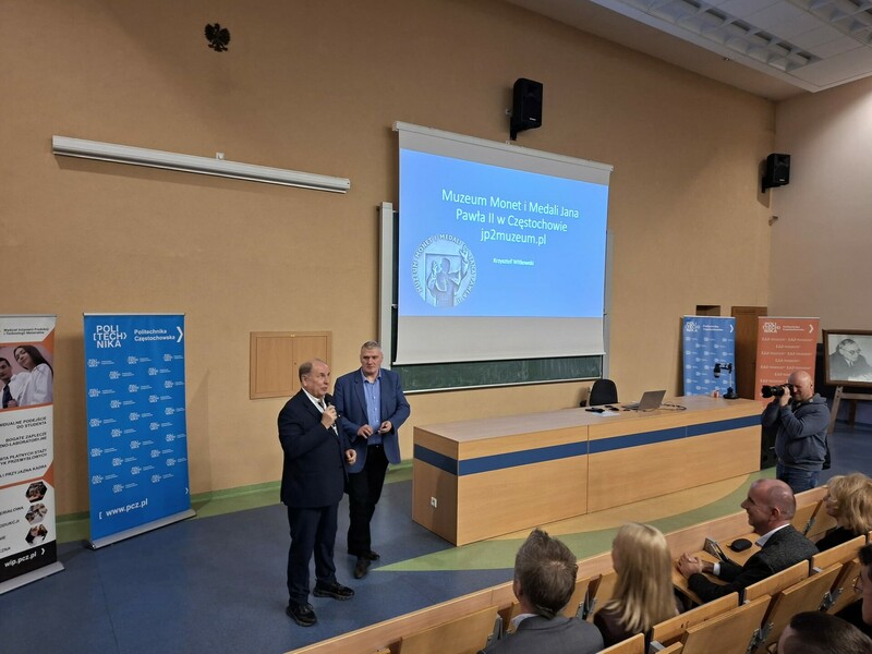 W drugiej części wydarzenia odbyło się spotkanie z przedstawicielami instytucji związanych z numizmatyką: Krzysztofem Witkowskim z Muzeum Monet i Medali Jana Pawła II w Częstochowie oraz Andrzejem Pasztą, Prezesem Częstochowskiego Oddziału Polskiego Towarzystwa Numizmatycznego. Prelegenci przedstawili zagadnienia dotyczące historii monet, metod ich wytwarzania, znaczenia symbolicznego oraz roli badań materiałowych w identyfikacji i konserwacji zabytków numizmatycznych. Podkreślili również, że moneta stanowi nie tylko środek płatniczy, lecz także istotny element dziedzictwa kulturowego.