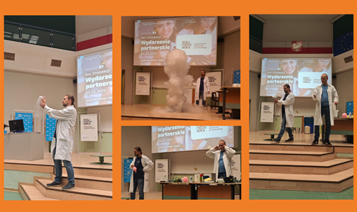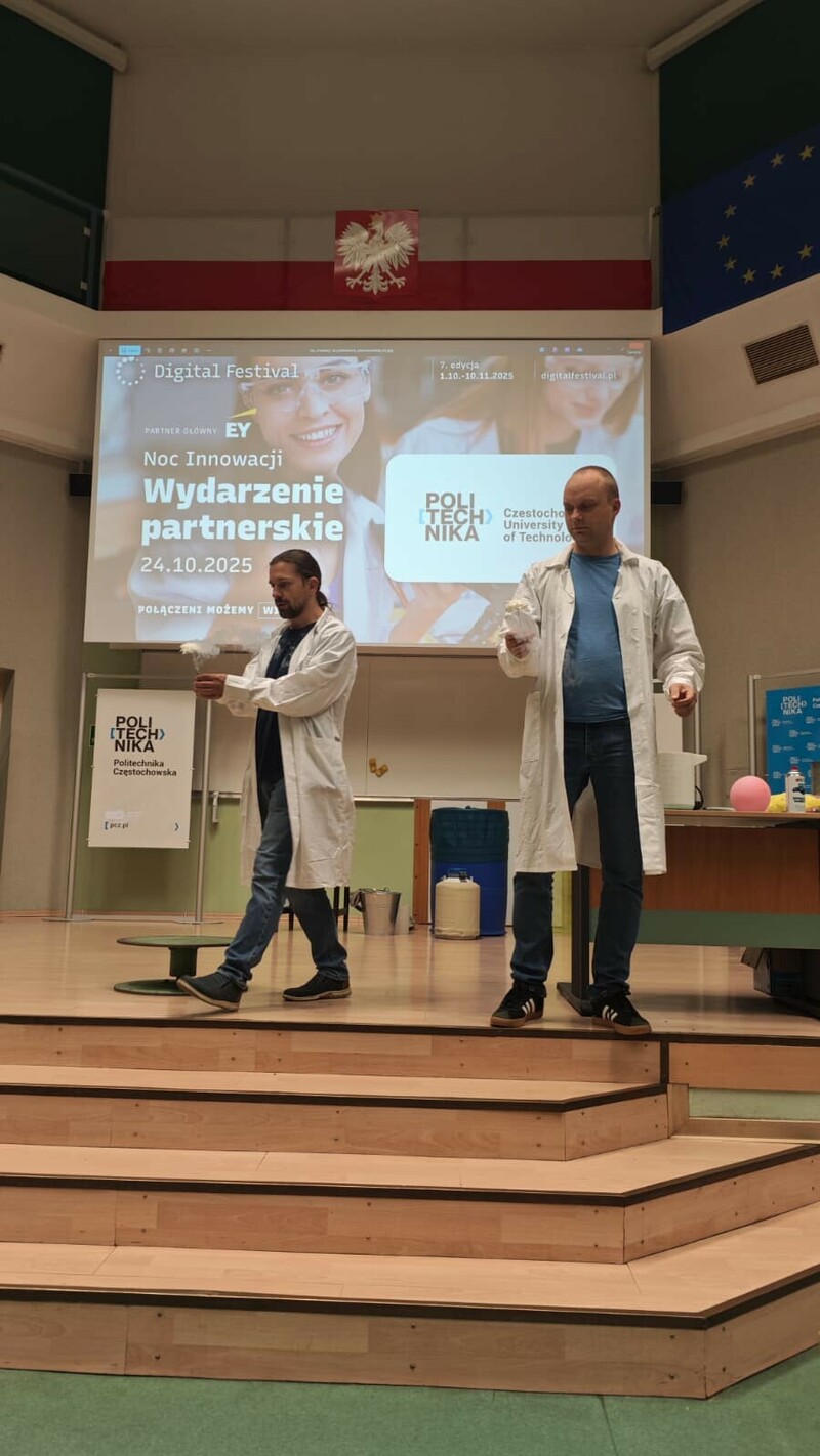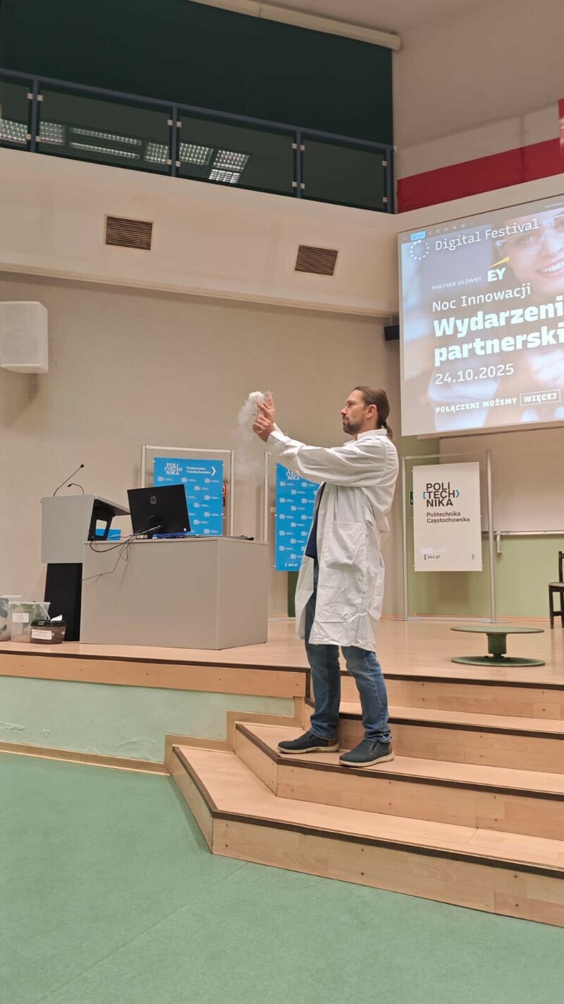 Szczególnym zainteresowaniem cieszył się pokaz przygotowany przez Wydział Inżynierii Produkcji i Technologii Materiałów, prowadzony przez dr. inż. Marcina Jarosika oraz dr. inż. Pawła Pietrusiewicza, zatytułowany „Fizyka wokół nas”. W trakcie spotkania naukowcy udowodnili, że fizyka może być fascynująca, a jej zasady mają bezpośrednie przełożenie na codzienne życie. Uczestnicy mogli obserwować eksperymenty i doświadczenia prezentujące zjawiska, które na co dzień towarzyszą nam w otaczającym świecie – od działania fal dźwiękowych, przez właściwości światła, po tajemnice energii i ruchu. Dzięki przystępnemu przekazowi i interaktywnej formie pokaz spotkał się z bardzo pozytywnym odbiorem zarówno wśród młodszych, jak i dorosłych uczestników.