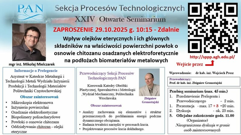 29 października odbyło się XXIV otwarte seminarium Sekcji Procesów Technologicznych PAN. Podczas spotkania mgr inż. Mikołaj Mielczarek zaprezentował referat pt. „Wpływ olejków eterycznych i ich głównych składników na właściwości powierzchni powłok o osnowie chitozanu osadzanych elektroforetycznie na podłożach biomateriałów metalowych”.